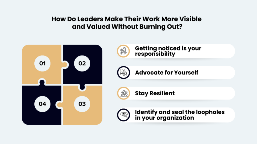 Don’t be afraid to advocate for yourself and your contributions. Volunteer for additional responsibilities, and high-impact projects, propose innovative ideas, and speak up in meetings to share your expertise and insights. Ensure consistent proactive reporting where you discuss and present your tasks and initiatives without being asked for. Asserting yourself in a professional manner can help you gain recognition for your talents and contributions.