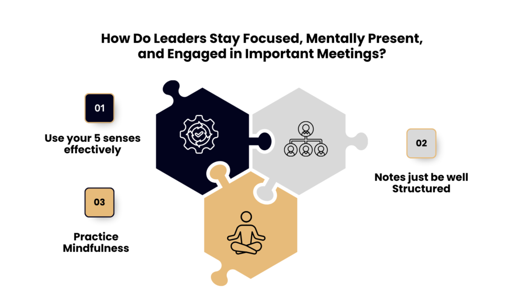 Follow the below-mentioned strategies and with consistent practice, you can improve your ability to remain attentive and engage constructively in meetings: